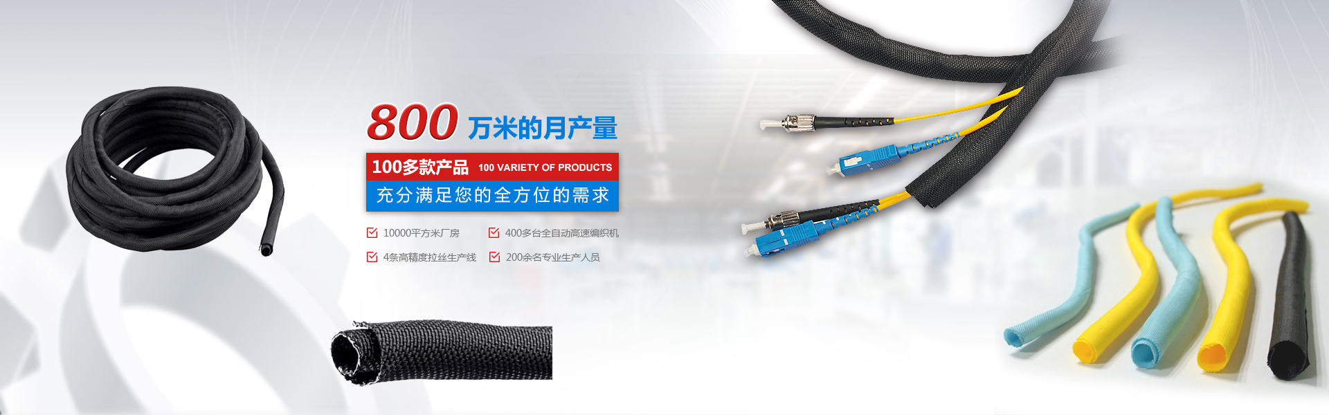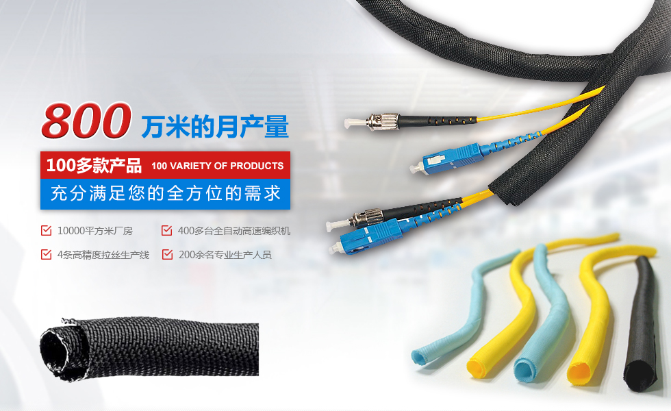 自主設計、研發、規?;笮蜕a企業 擁有廠房10000平米,400多臺全自動。高速編織機四條高精度紡絲生產線,員工200余人,月產量800萬米,中國最大絕緣保護套管生產企業之一。